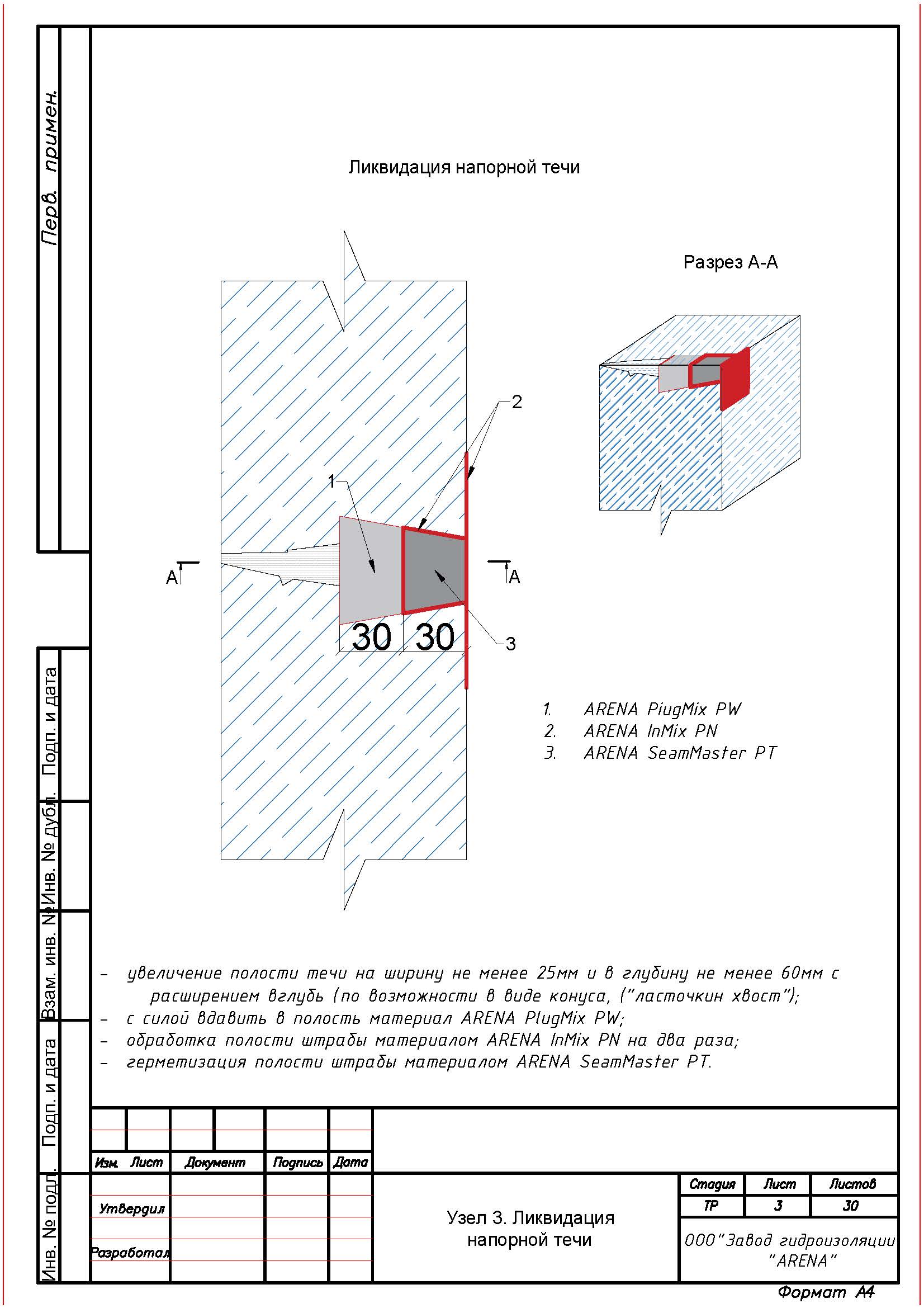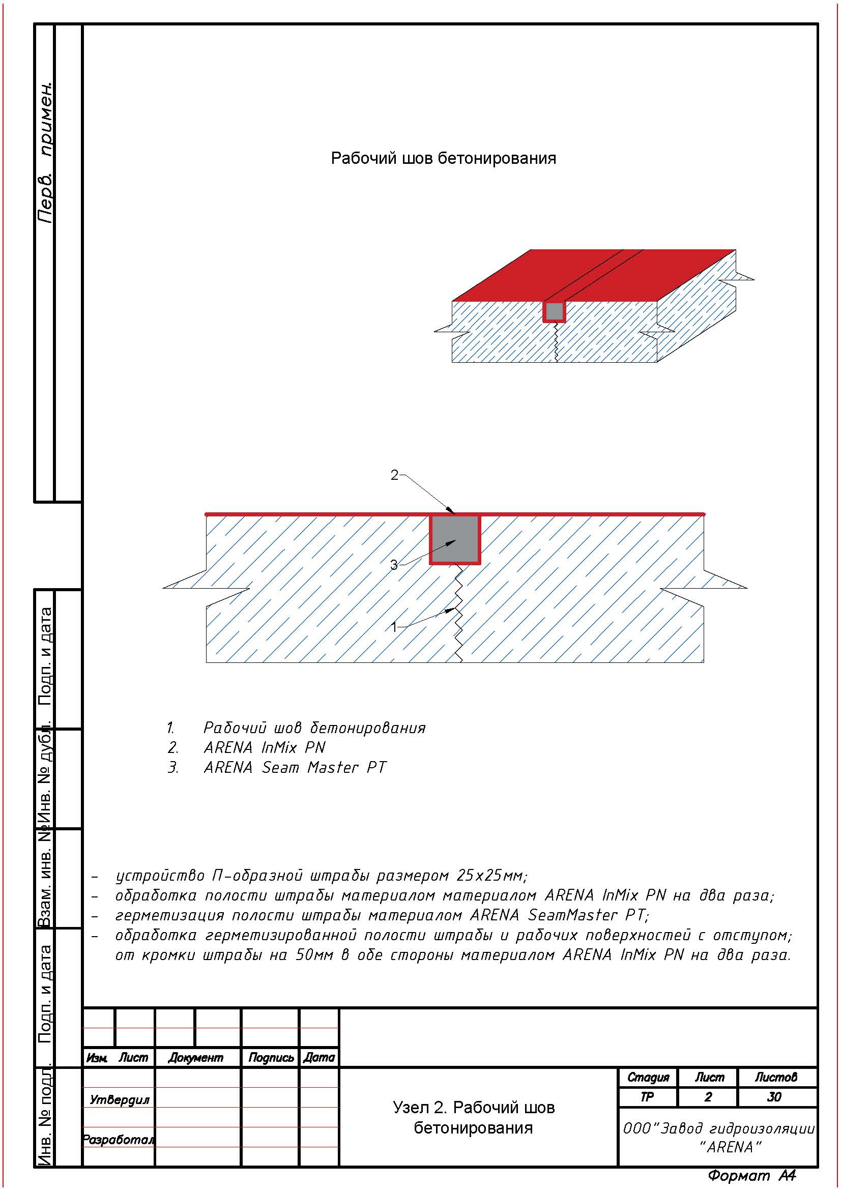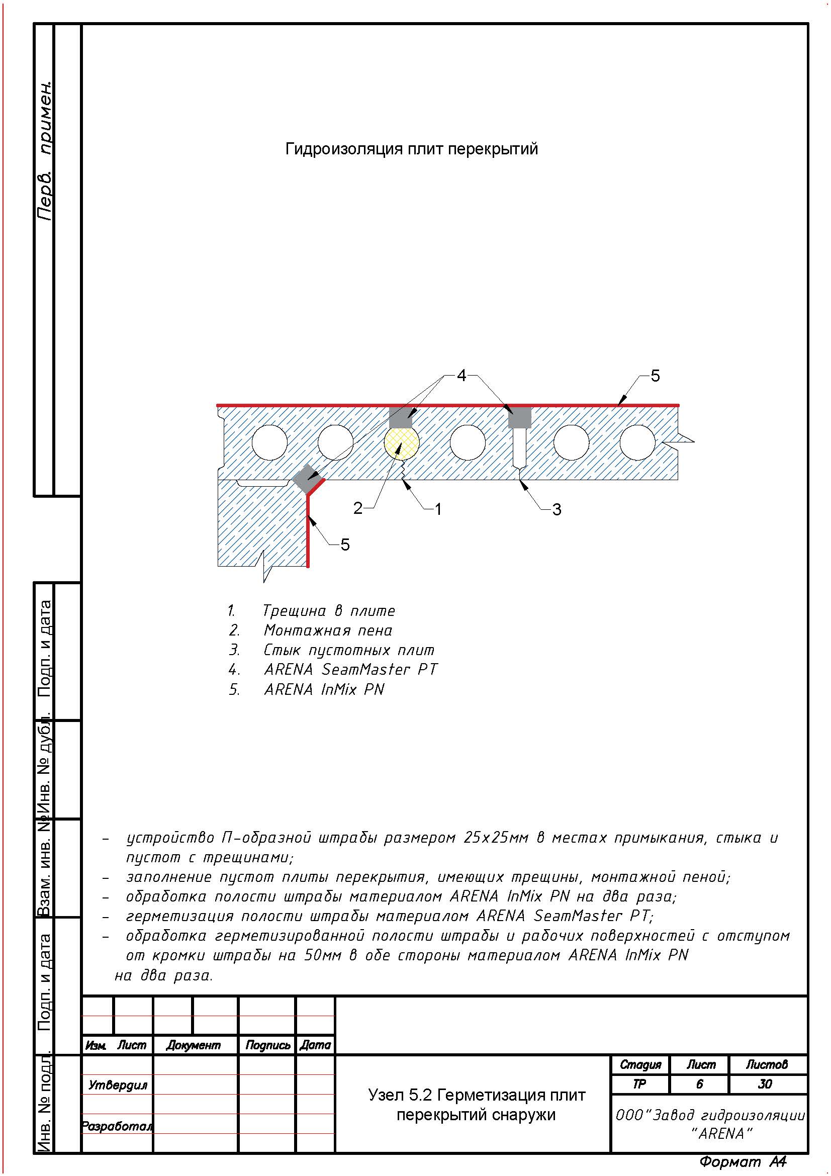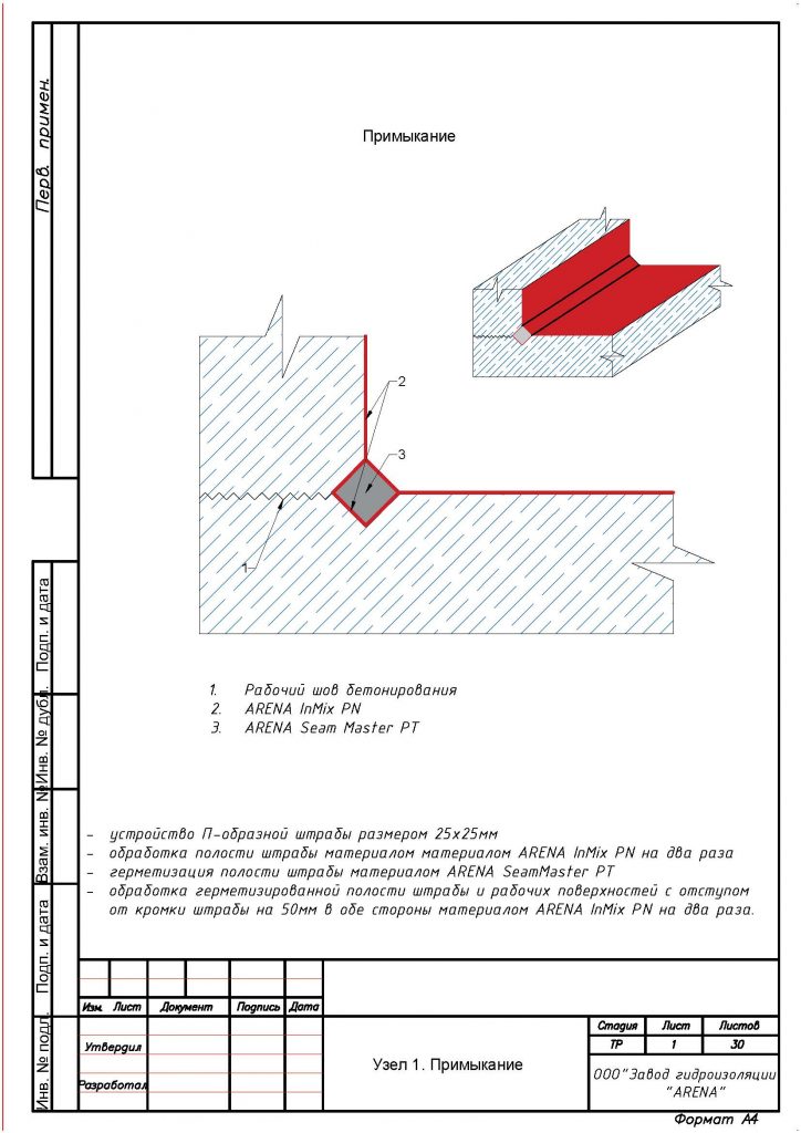 С помощью штробореза и отбойного молотка выполнить вдоль трещин, швов, стыков, вводов коммуникаций, сопряжений, примыканий штрабу сечением не менее 25 х 25 мм. Штрабу тщательно очистить от мусора и рыхлого бетона с помощью щетки с металлическим ворсом, обильно увлажнить и загрунтовать одним слоем растворной смеси ARENA InMix PN (расход 0,1 кг/м.п.).