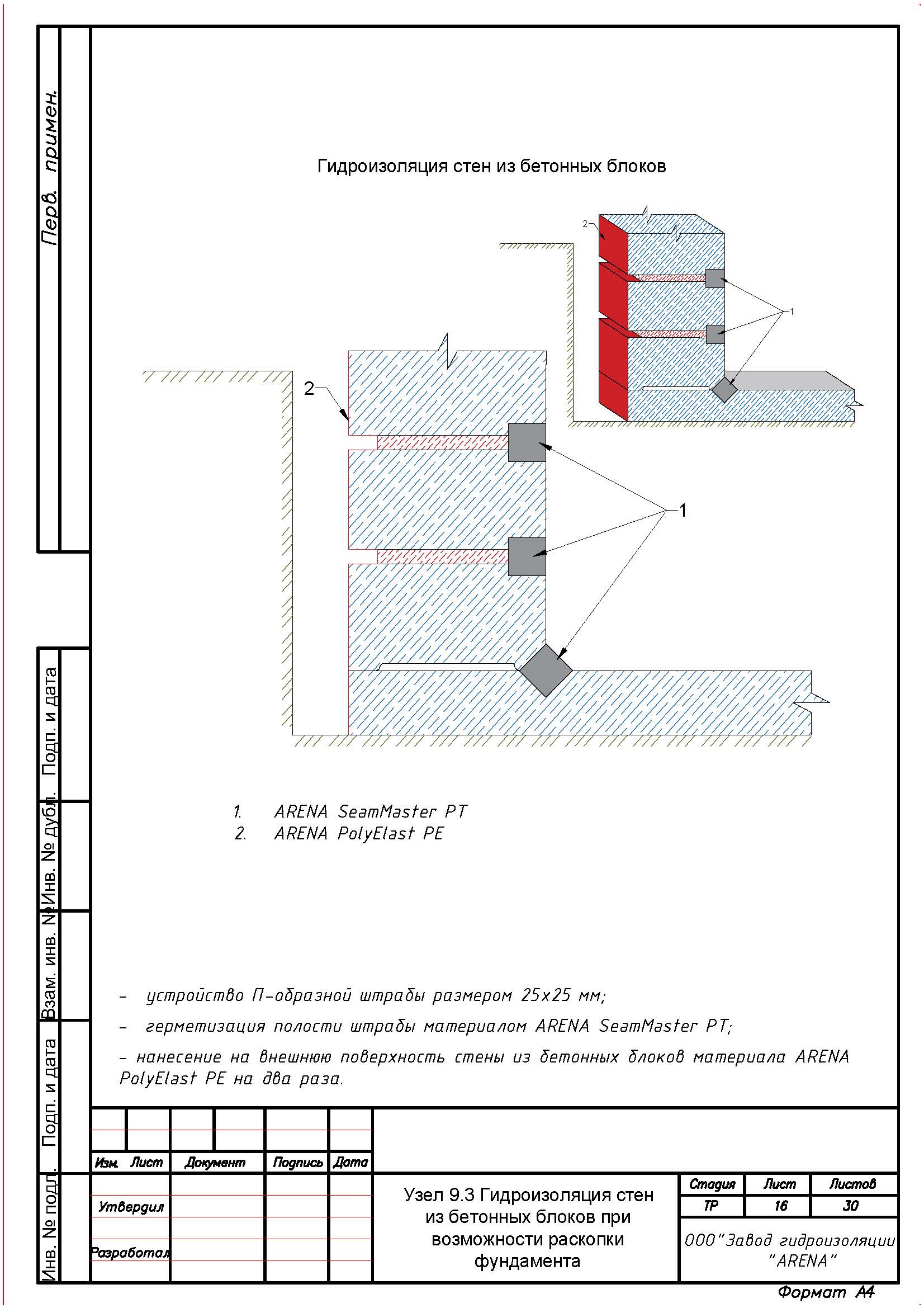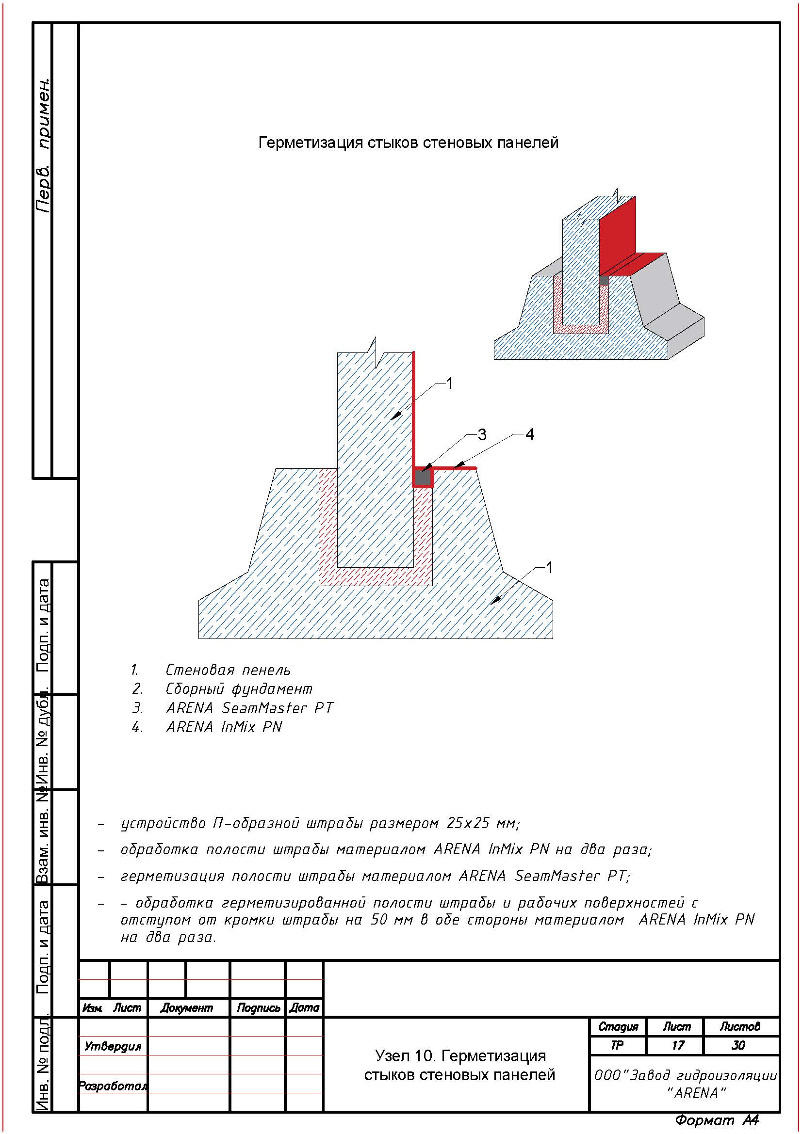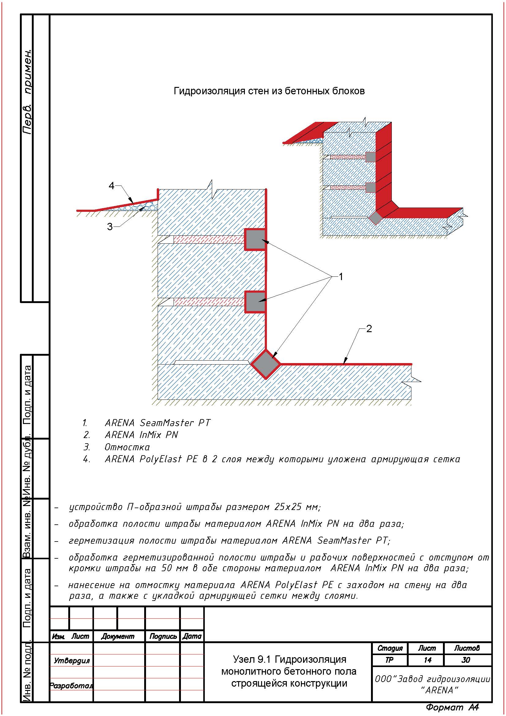 С помощью штробореза и отбойного молотка выполнить вдоль трещин, швов, стыков, вводов коммуникаций, сопряжений, примыканий штрабу сечением не менее 25 х 25 мм. Штрабу тщательно очистить от мусора и рыхлого бетона с помощью щетки с металлическим ворсом, обильно увлажнить и загрунтовать одним слоем растворной смеси ARENA InMix PN (расход 0,1 кг/м.п.).